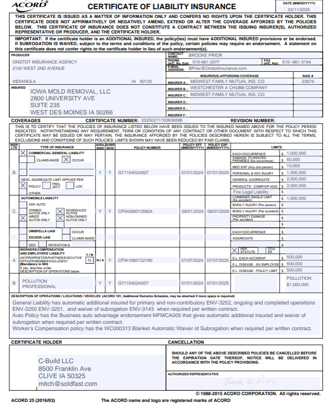 While DiY projects may be possible for small patches of mold, you should contact specialists for larger rooms and any whole-house jobs. Insufficient cleaning means mold spores would continue to spread, and may even develop resistance to the cleaning materials. You also want a specialist because standard contractor liability insurance doesn’t cover environmental contamination from mold and mildew, and similarly, most homeowner’s insurance policies exclude coverage for this type of contamination. With the certificate we received below, you can see that the environmental insurance (ENV) policies are included.