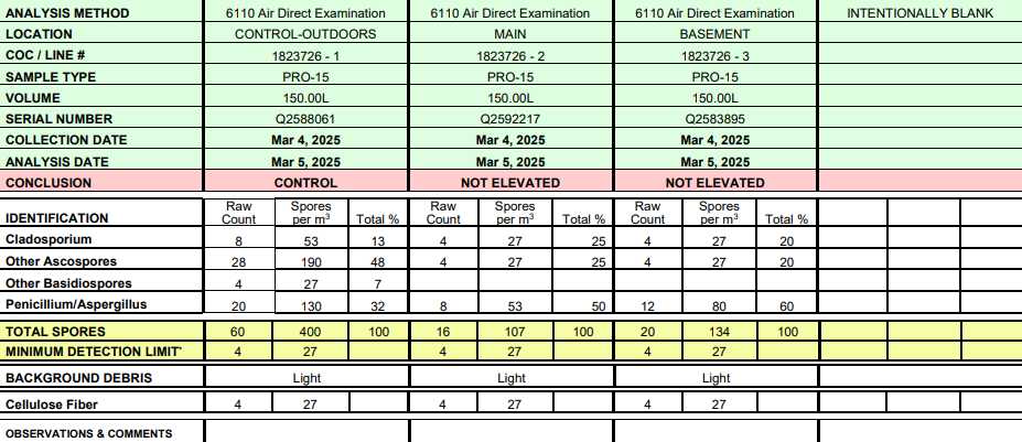 A full inspection for mold, meanwhile, isn’t needed unless you suspect a hidden and dangerously widespread infestation, which could be the case if there’s lots of visible mold and extremely humid conditions. You should not skimp on the inspection at this point, because professionals have the equipment and experience to find mold without disturbing (and spreading) it. They should be able to explain their findings and provide a detailed report comparing the spore concentrations with conditions outdoors, like the one we received below: